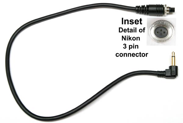 This adapter plugs into the proprietary 3-pin port available on many Nikon SB flash units (see flash listing below) and provides flash sync for a Pocket Wizard, Skyport, or CyberSync receiver. The other end of the cord is a gold plated, right angle mono miniphone plug (1/8" – 3.5mm – 2 conductor)