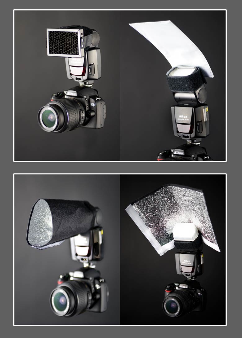 Attach the 4cm (1.5") wide velcro ring around your flash head, then attach the various accessories to the velcro ring on the flash.